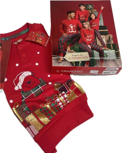 Pigiama manica lunga bambina in caldo cotone dalla linea Granchio Family con stampa Natale sulla maglia serafino, pantalone stampato tartan.