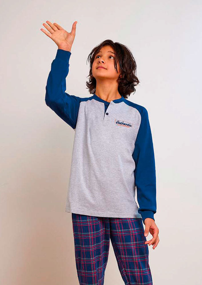 Pigiama manica lunga ragazzo in caldo cotone, maglia scollo serafino con manica raglan a contrasto, pantalone stampato all over con polsino