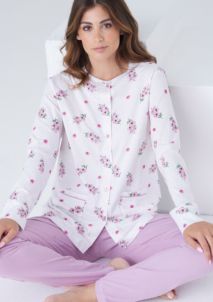 Pigiama aperto manica lunga donna, maglia stampata all over con chiusura bottoni e tasche, pantalone dritto tinta unita