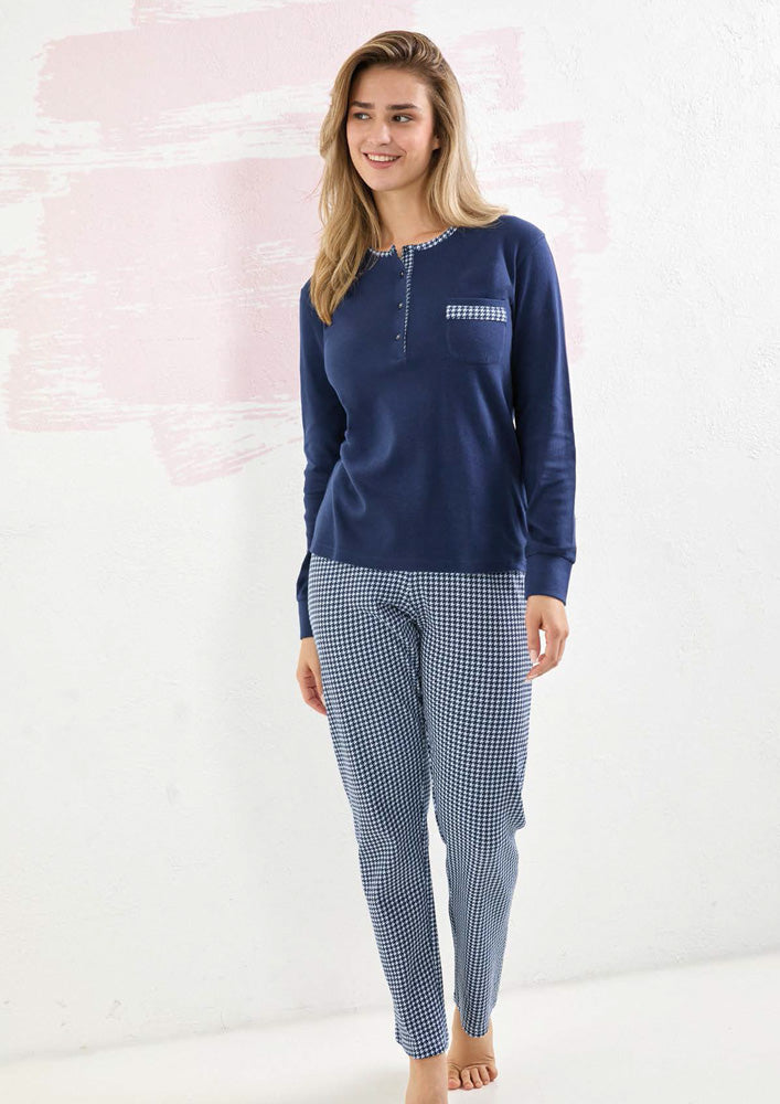 Pigiama manica lunga donna in caldo cotone, maglia scollo serafino con dettagli stampati e taschino; pantalone stampato all over con polsini.