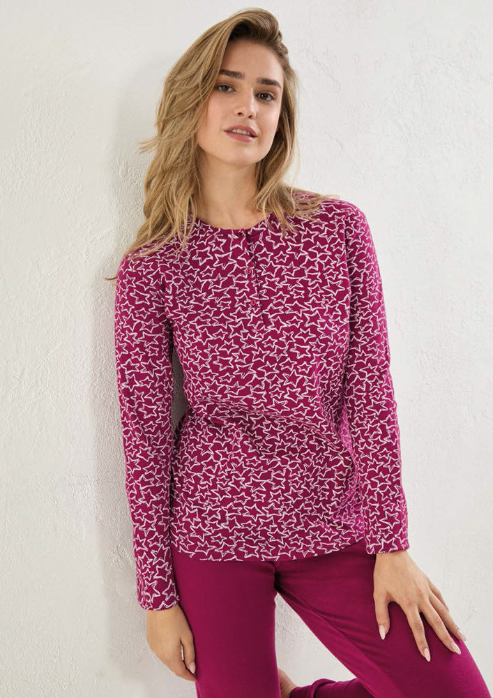 Pigiama manica lunga donna in caldo cotone, maglia scollo serafino con stampa all over, pantalone tinta unita con polsino