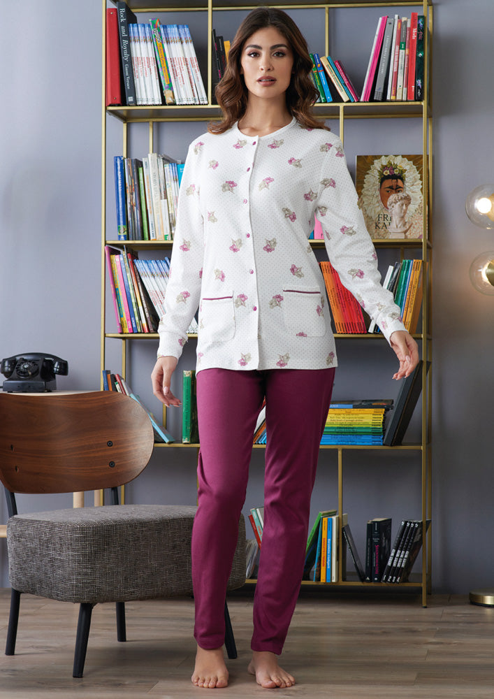 Pigiama aperto manica lunga donna in caldo cotone, maglia con chiusura bottoni, stampa all over e taschini; pantalone dritto tinta unita.