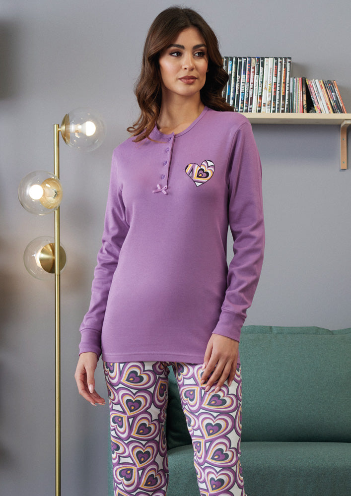 Pigiama manica lunga donna in caldo cotone, maglia serafino con piccola stampa sul fronte, pantalone stampato all over.