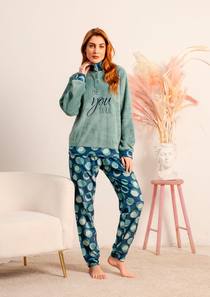 Pigiama manica lunga donna in coral; maglia con collo serafino alto, ricamo e dettagli stampati, pantalone stampato all over con polsino