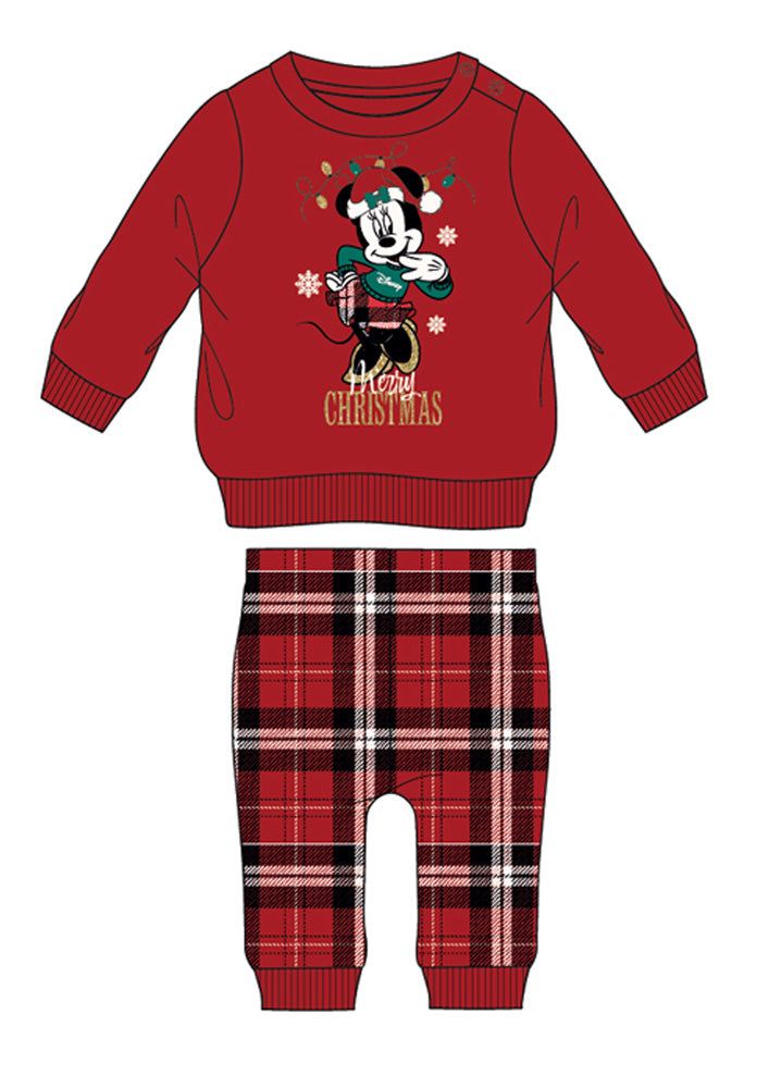 Pigiama girocollo con bottoni spalla a manica lunga neonata con stampa Natale cartoon Disney Family Minnie, pantalone quadrettato lungo con polsino.