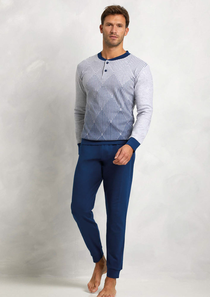 Pigiama manica lunga uomo in caldo cotone, maglia scollo serafino stampata all over con polsi e bordo a contrasto, pantalone tinta unita con polsino.