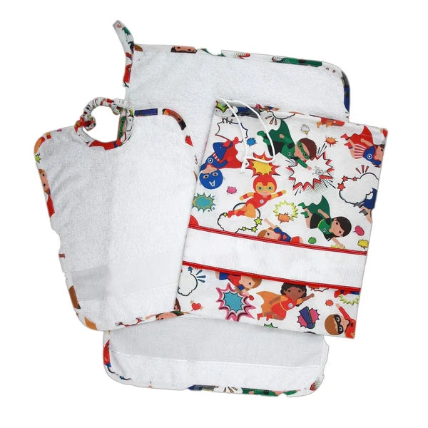 Tris Asilo Cartoon con asciugamano 40x60 + bavetta con elastico 25x35 + sacchetto con tela stampata 32x37
